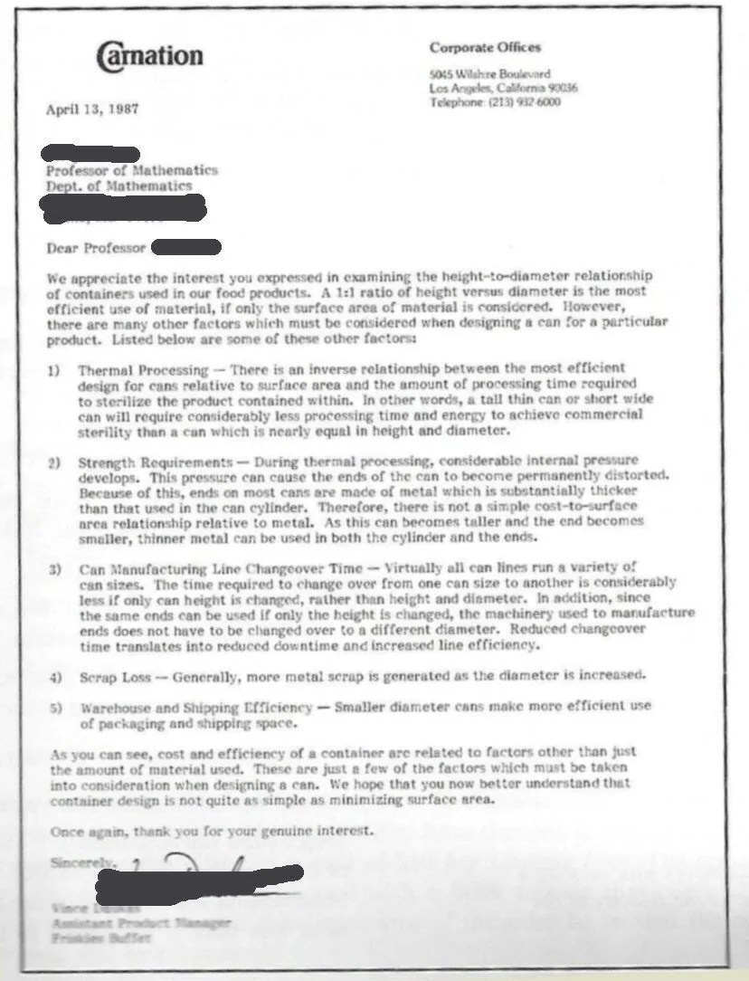 The other half of the title refers to a well-known letter sent by Carnation to a math professor who had proposed a 1:1 height-to-diameter redesign for their cans. His suggestion was to minimize surface area and therefore material use, but ignored other constraints.